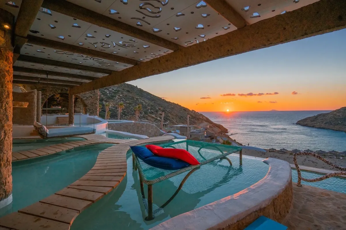 Each suite and villa is individually designed and equipped with private pools, outdoor jacuzzis, and sweeping views of the Aegean Sea.